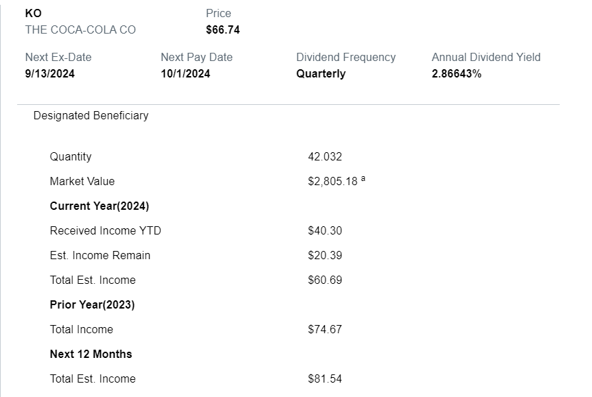 If you look at the image above, you’ll see that the income received so far this year for Coca-Cola, ticker symbol KO, is $40.30, with remaining income for the year at $20.39, bringing the total to $60.69.