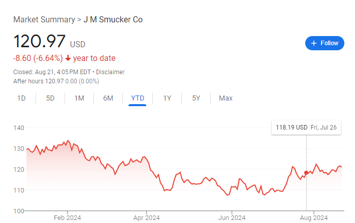 A couple of days ago, J.M. Smucker’s stock was sitting at $118 when I first started writing this blog post. Looking at the chart, you can see that it’s down 6.64% for the year, translating to a loss of $8.60 per share. It’s important to keep in mind that if you own multiple shares of a company, you’ll see larger losses or gains on your balance sheet.