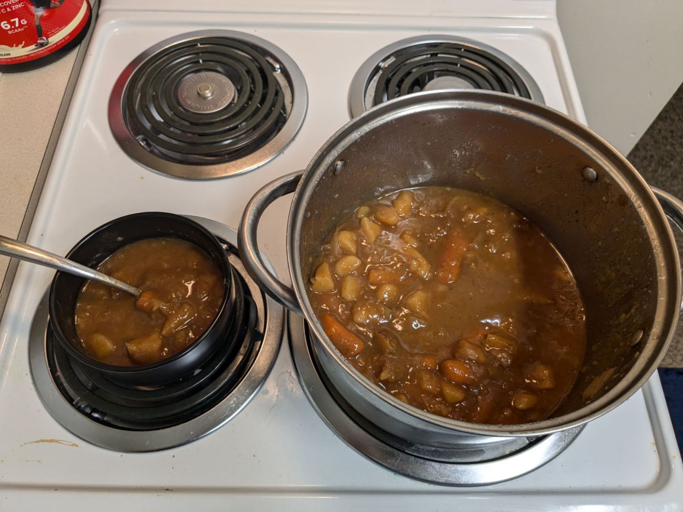I did four cups of the beef broth and used a little over half of the baby carrots, about four medium russet potatoes, and a little over half of the onion and cooked it for 45 minutes.