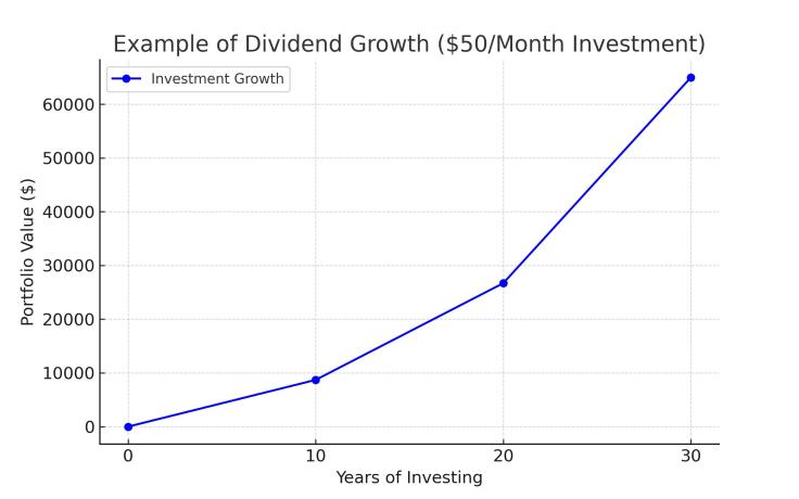 Here’s a graph illustrating the Example of Dividend Growth. It shows how a $50/month investment in dividend stocks can grow over 30 years with reinvested dividends.
